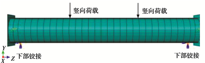 纵向加劲肋、钢骨、混凝土及钢管均选用8节点减缩积分实体单元(C3D8R)。钢管和混凝土之间的相互作用采用接触模拟,法向为硬接触,切向为罚摩擦,摩擦系数取0.60[19]。在试件底部距左右两侧150 mm处设置铰接,一侧约束试件沿X、Y、Z方向的平动和绕Y、Z轴的转动,另一侧约束试件沿X、Y方向的平动和绕Y、Z轴的转动,在试件Z轴方向三分点处施加沿Y轴负方向的竖向位移荷载,试件有限元模型如图 12所示。