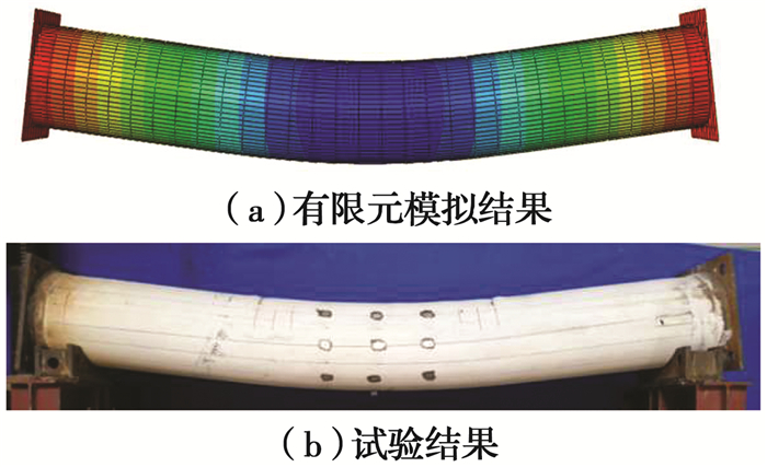 有限元与试验破坏形态、荷载-位移曲线对比如图 13、图 14所示。由图可知,二者破坏形态基本一致,有限元与试验弯矩-位移曲线吻合较好,二者承载力接近,初始刚度略有差异,其原因为有限元分析中加载方式和边界条件均为理想状态,而试验过程中存在接触间隙和加载误差等导致试验初始刚度略低于有限元模拟结果。总体上,有限元分析能较好地反映试件的受力过程。