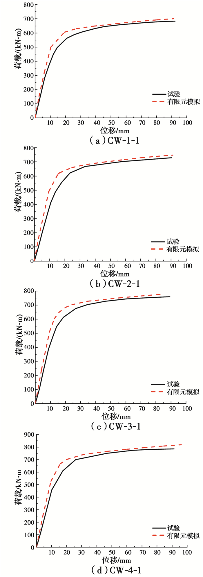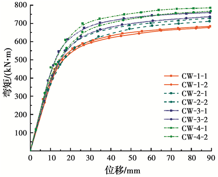 各组试件的弯矩-跨中挠度曲线如图 8所示。加载时,CW-1组试件放置方式相同,因此两个试件的弯矩-跨中挠度曲线基本重合; CW-2、CW-3、CW-4组试件第2个试件均相对第1个试件旋转45°放置,当中和轴位于形心轴时,上述两种不同放置方式的试件截面惯性矩相同。加载过程中受弯试件受拉区混凝土抗拉能力较差,实际中和轴位置高于形心轴,导致二者在受力过程中截面惯性矩和抗弯刚度有所不同,故每组两个试件的刚度和极限承载力并不完全一致,但相差不大。