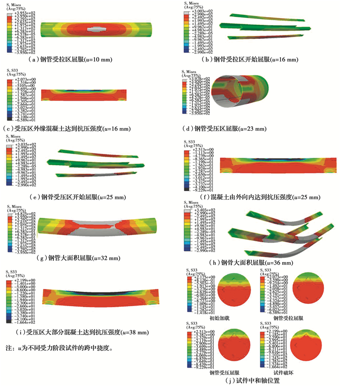 图 15为外钢管设置纵向加劲肋、同时内配格构式钢骨试件CW-4的应力发展过程。加载初期,试件处于弹性阶段,钢管与混凝土共同工作,随着荷载的增加,受拉区外侧混凝土开裂并不断向上延伸,试件中和轴上移,下部钢管承受较大的拉力; 当受拉区钢管跨中进入屈服时(图 15(a)),试件进入弹塑性阶段,钢管塑性区逐渐扩展,受拉区钢骨开始屈服(图 15(b)),此时受压区外侧混凝土达到抗压强度(图 15(c)); 随着荷载的继续增加,受压区最外侧钢管也逐渐屈服(图 15(d)),受压区钢骨应力增大(图 15(e)),混凝土塑性区由外向内扩展(图 15(f)),试件进入塑性强化阶段,荷载增长速度明显减缓。随着纯弯段钢管大面积屈服(图 15(g))、钢骨受压屈服(图 15(h))、大部分混凝土达到抗压强度(图 15(i))。加载过程中试件中和轴不断上升,由直线变为曲线(图 15(j))。