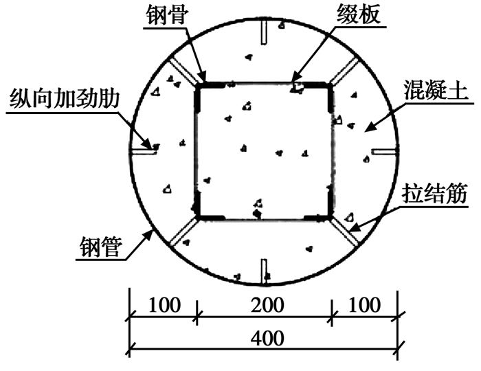 格构式钢骨钢管混凝土构件是指在钢管混凝土柱中埋入钢骨(角钢),钢骨之间用缀板连接,并在钢管内壁焊接纵向加劲肋的一种新型组合构件。与传统钢管混凝土构件相比,钢骨和纵向加劲肋可增强钢材对核心混凝土的约束,从而提高构件的强度和刚度,减小外钢管的厚度; 混凝土可防止钢骨与加劲肋的局部屈曲。与内配工字钢、交叉工字钢等钢管混凝土构件相比,格构式钢骨离截面中和轴较远,可增大受弯构件的截面模量,改善截面的力学性能,在同等约束条件下可减少钢材用量。目前,学者们对内配纵向加劲肋、工字钢、钢骨等钢管混凝土构件的力学性能开展了一系列研究。Kitada[1]对钢管壁焊接纵向加劲肋的钢管混凝土构件进行了试验研究,结果表明,在钢管壁焊接纵向加劲肋能改善钢管的稳定性,延缓钢管的局部屈曲,增强钢材对核心混凝土的约束作用,从而提高构件的承载能力。Zhu等[2]对26个钢骨方钢管高强混凝土柱进行了轴心受压试验,结果表明,钢管混凝土构件内配钢骨能改变构件的破坏模式和屈服后的性能。Chen等[3]对内配角钢的钢管混凝土柱进行了轴拉试验,结果表明,配有钢筋或角钢的钢管混凝土柱弹性刚度提升较为明显,承载力提升有限。Elchalakani等[4]、Kennedy[5]对矩形、方形、圆形钢管混凝土构件进行了纯弯试验,结果表明,钢管与混凝土能协同工作,并且钢管内填充混凝土可提高构件的强度和延性。Chang等[6]采用有限元方法对钢骨钢管混凝土柱的力学性能和破坏机理进行了对比分析,结果表明,钢骨钢管混凝土柱比普通钢管混凝土柱具有更高的承载力和刚度。何益斌等[7]对2个钢管混凝土构件、11个钢骨钢管混凝土构件进行了偏心受压试验,结果表明,内置钢骨可有效提高钢骨钢管混凝土构件的偏压极限承载力。王博等[8]采用统一强度理论对轴心受压钢骨组合L形钢管混凝土短柱的核心混凝土、型钢钢骨在三向受压应力状态下的极限承载力进行了分析。刘晓等[9]对配有工字形钢骨的钢管高强混凝土构件进行了抗弯试验,主要研究参数为配骨指标和钢骨加载方向(强轴和弱轴),结果表明,极限弯矩随配骨指标的增加呈非线性增长。徐菲等[10]对4组格构式钢骨钢管混凝土柱进行了轴压试验,结果表明,钢骨钢管混凝土柱的受力过程均经历弹性阶段、屈服阶段和破坏阶段,钢骨能与钢管、混凝土共同工作,协同变形。查晓雄等[11]对内配钢筋、圆钢管及工字钢的钢管混凝土构件进行了纯弯试验,并给出承载力计算公式,结果表明,内配加劲件的钢管混凝土构件在纯弯作用下具有较好的延性。