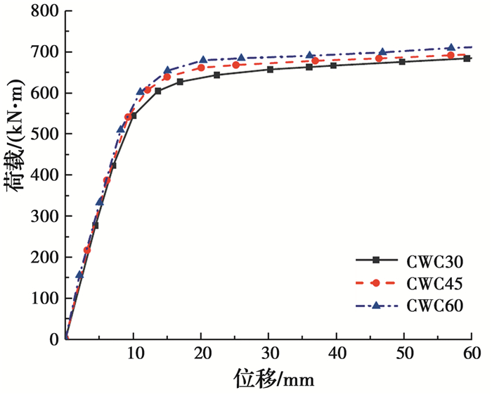 图 20为混凝土强度等级分别为C30、C45、C60的内配格构式钢骨钢管混凝土构件的弯矩-位移曲线。由图 20可知,随着混凝土强度等级的提高,构件抗弯承载力略有增长。混凝土强度等级对构件抗弯承载力影响较小,这是由于构件受弯时参与受压的混凝土较少,混凝土的主要作用是支撑钢管,防止其受弯屈曲。