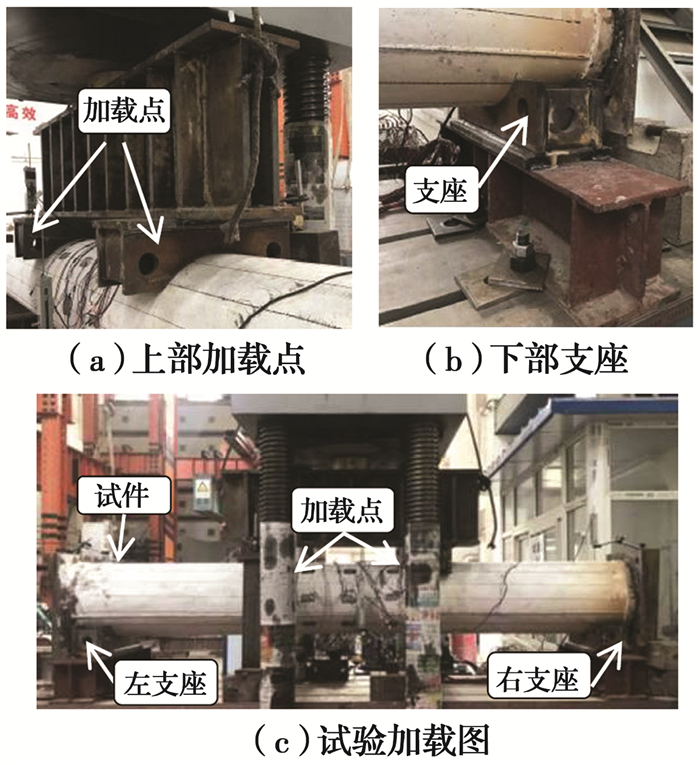 试验在500 t电液伺服压力试验机上进行,试验装置如图 3所示,采用三分点加载方式。为模拟简支边界条件,制作了两个带有一定宽度的弧形支座,如图 3所示,左侧支座只允许试件发生绕垂直于加载面方向的转动,右侧支座只允许试件发生轴向位移和绕垂直于加载面方向的转动。