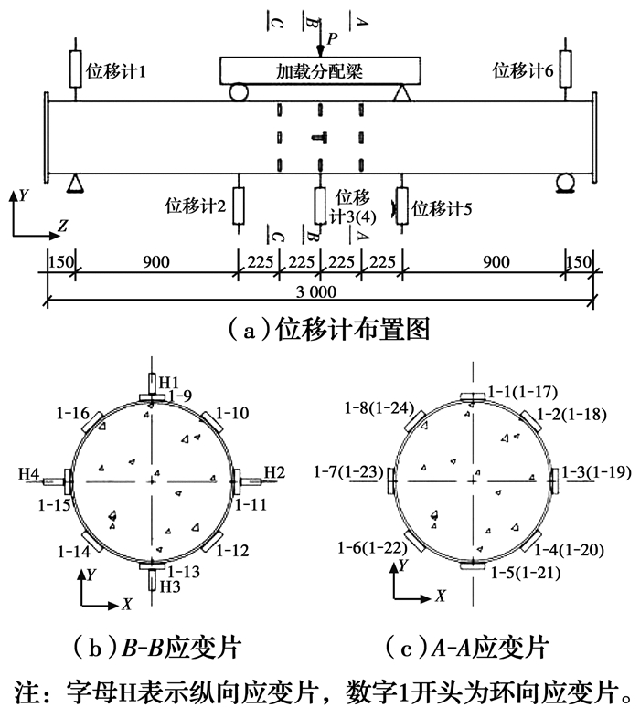 测点布置如图 4所示。在试件跨中截面间隔布置纵向和环向应变片,在纯弯段四分点处间隔布置环向应变片,以测量试件纯弯段各截面的纵向和环向应变。在试件支座、加载点、跨中位置布置位移计,以测量试件的竖向位移。