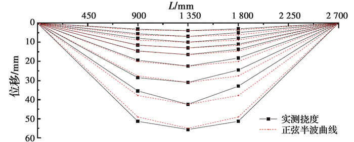 各组试件试验现象和破坏形态基本一致,如图 5所示。加载初期试件均无明显变化,随着荷载的增加,试件轻微弯曲,荷载进一步增加,试件跨中挠度不断增大,两端向上翘起,弯曲逐渐明显; 同时,由于在加载点卡槽处应力集中,内部混凝土局部压碎,钢管在加载点处轻微鼓曲。整个加载过程中,试件均表现出优异的延性和变形能力; 由于混凝土对钢管壁的支撑作用,各试件纯弯段钢管均未出现局部鼓曲,图 6为试件CW-4-2在加载过程中挠度沿试件长度的变化情况。由图 6可知,试验过程中,内配格构式钢骨钢管混凝土试件的挠曲线基本呈对称的正弦半波曲线。