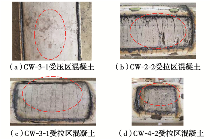 试验结束后,割开部分试件的外钢管,观察试件受拉区、受压区内部混凝土的破坏情况,如图 7所示。由图 7(a)可以看出,试件CW-3-1受压区混凝土出现纵向裂缝,表明试件破坏时受压区混凝土在压应力作用下被劈裂,裂缝沿长度方向发展,但宽度方向较小。对比不同组试件受拉区混凝土裂缝的开展情况可知:与配有格构式钢骨的试件CW-3相比,仅设有纵向加劲肋的试件CW-2受拉区裂缝间距更小,分布更为密集; 试件CW-3与同时设有纵向加劲肋和格构式钢骨的试件CW-4裂缝开展情况相似。由此可知,试件内设格构式钢骨能有效减少受拉区混凝土裂缝的产生,其原因为格构式钢骨增强了试件的整体性,对混凝土的约束作用更强,在受力过程中可为受拉区混凝土分担更多的拉力,从而延缓受拉区混凝土裂缝的产生和发展。