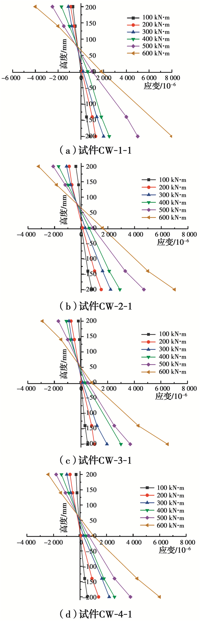 图 9为各试件弯矩为100~600 kN·m时跨中截面纵向应变分布情况。由图 9可知,各试件中和轴高度随荷载的增加沿截面逐渐上升,各级荷载下应变-截面高度曲线基本呈直线,即加载过程中纯弯段跨中截面的应变沿截面高度呈线性变化,应变发展符合平截面假定。