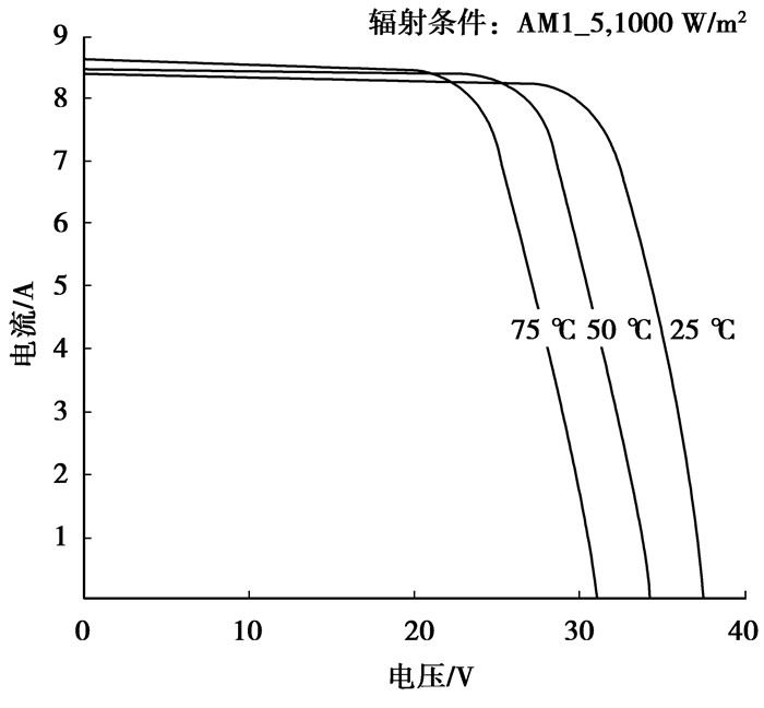 1.1.2 单晶硅PV组件单晶硅PV组件CNPV-240M(东营光伏),尺寸为1 650 mm×985 mm,开路电压Voc为37.6 V;短路电流Isc为8.40 A;最大功率电压Vmp为30.8 V,最大功率电流Imp为7.80 A。组件功率温度效应系数为-0.45(%/℃),不同工作温度下,组件的I-V曲线,如图 1所示。