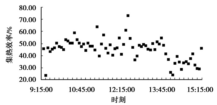 已知PV/R组件进出口的温差及循环媒介流量,根据公式(5),求其集热效率,PV/R组件的集热效率为45%左右,如图 12所示。