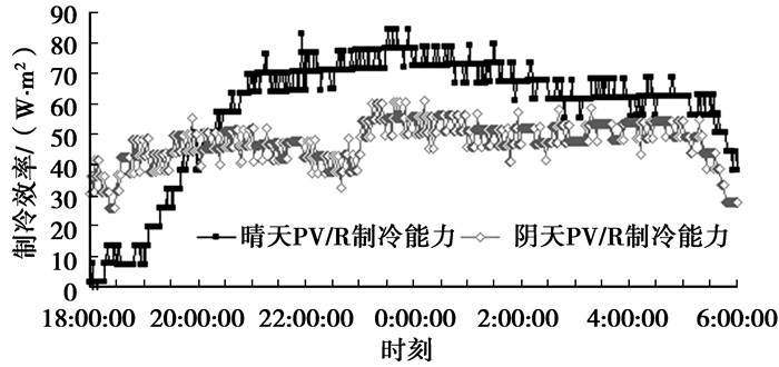阴天时,由于大气透明度较低,PV/R组件的制冷能力下降;晴天时,PV/R的制冷能力较高。综上所述,PV/R组件的制冷能力为40~80 W/m2。