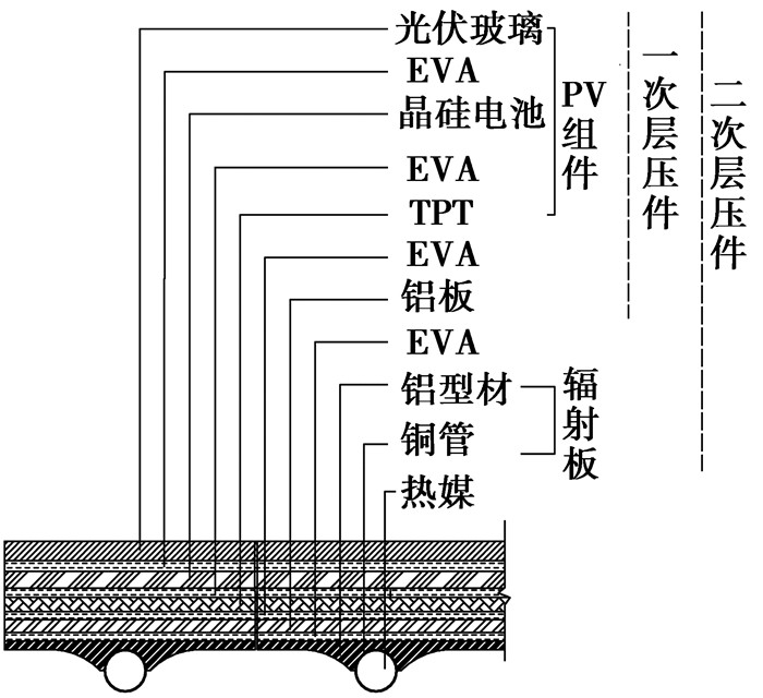 PV/R组件是将辐射板与电池组件耦合,在光伏组件及辐射板之间,可耦合一层薄铝板,用于均匀传力及传热。光伏辐射板组件的构造,如图 2所示。
