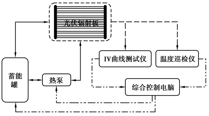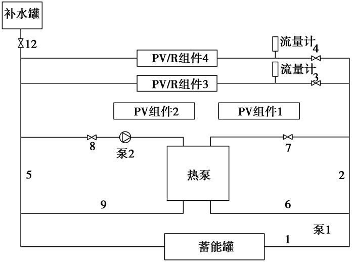 为避免组件彼此的遮挡,测试组件间距为3.7 m。设置1.2 m3的冷热收集箱;1.5 kW制冷量的热泵机组;额定流量1.8 m3/h,功率275 W的循环泵;量程范围0~1.2 m3/h,精度为10 L/h的流量计,此外,配备了I-V曲线仪,Pt100传感器(精度为0.1 ℃),多路巡检仪及其它数据采集分析等设备,如图 4所示。