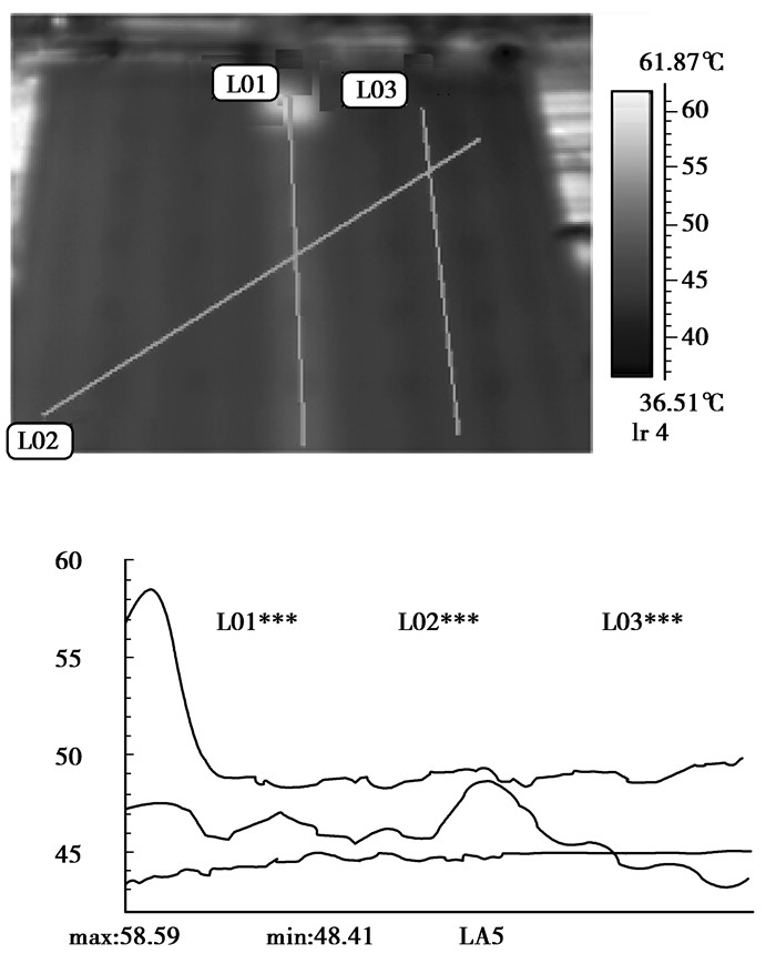 PV/R组件热性能受到背部管路排布、循环流量、进出口温差等的影响。通过红外热像仪(飒特G-90)的分析,PV/R组件正面的温度分布,如图 9所示。