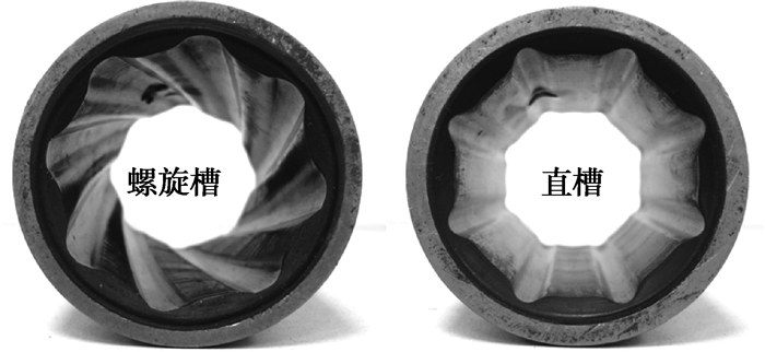 1 实验装置与实验方法 1.1 试样与实验装置为了充分掌握螺旋槽水润滑橡胶合金轴承的摩擦学性能,选取同规格的直槽水润滑橡胶合金轴承进行对比实验。螺旋槽和直槽水润滑橡胶合金轴承试样均为8沟槽与多圆弧曲面的橡胶轴承。轴承规格为内径40 mm,外径55 mm,长度80 mm。试样实物如图 1所示。
