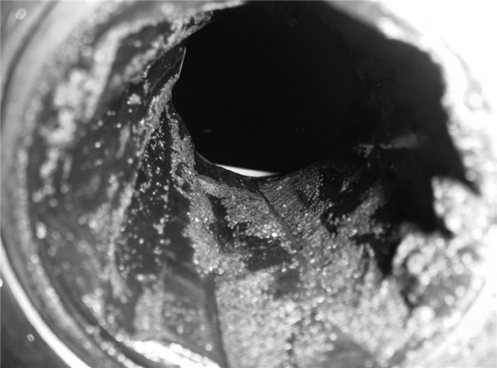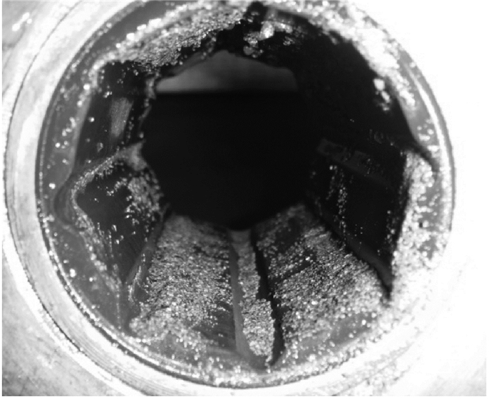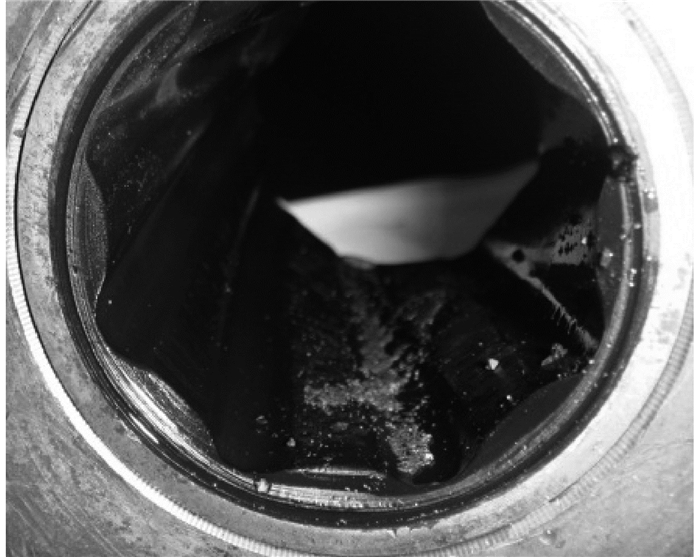 图 8和图 9分别为含沙量为0.27%环境下的螺旋槽和直槽水润滑橡胶合金轴承泥沙分布情况。通过对比发现:螺旋槽水润滑橡胶合金轴承内的残余沙较少,且分布于橡胶螺旋沟槽内,而橡胶承载面上几乎没有泥沙;直槽水润滑橡胶合金轴承内的残余泥沙较多,分布于橡胶沟槽内和橡胶承载面上。