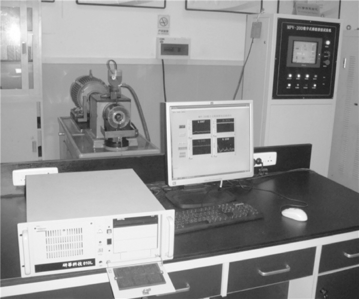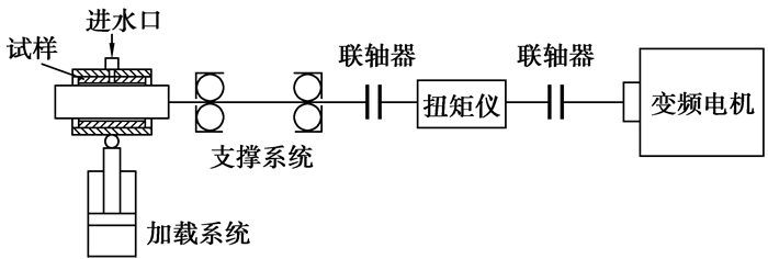 实验装置为重庆大学机械传动国家重点实验室改进的MPV-20D摩擦磨损试验机,如图 2和图 3所示。该装置主要由驱动部分、试验部分、加载部分和测试部分组成。驱动部分采用交流变频电机驱动。试验部分包括主轴、支架、联轴器和供水系统。加载系统由液压缸、液压泵及阀路组成,实现径向加载,模拟螺旋桨的悬重而使艉轴偏斜所造成的边缘负荷。测试部分由扭矩仪和工控机组成,被测物理量传输到计算机,通过测试软件进行数据存储和处理。