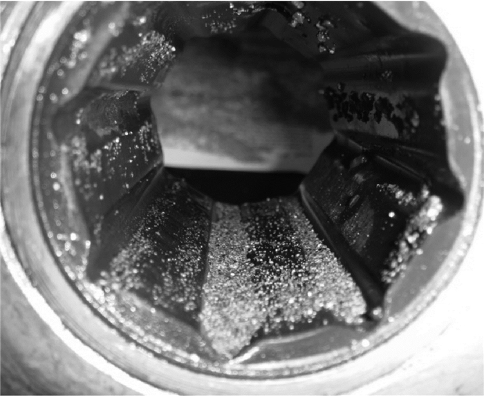 图 12和图 13分别为含沙量为3.38%环境下的螺旋槽和直槽水润滑橡胶合金轴承泥沙分布情况。图中可以看出,在含沙量较大环境下水润滑橡胶合金轴承泥沙明显多于含沙量小的环境。螺旋槽水润滑橡胶合金轴承内的残余沙较少,主要分布于橡胶螺旋沟槽内,在承载面上只有少量泥沙;而直槽水润滑橡胶合金轴承内的残余泥沙较多,橡胶沟槽内和承载面上均分布大量泥沙。可见,螺旋槽水润滑橡胶合金轴承具有良好的排污能力,与同类轴承相比具有更长的使用寿命。