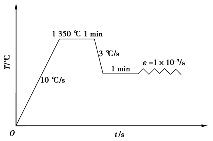 试样夹持好后,试样室通入流量为1.0 L/min的氩气流,并以10 ℃/s的速度加热至1 350 ℃并保温1 min,之后,以3 ℃/s的速度降到测试温度,保温1 min后以ε=1×10-3/s的形变速率对试样进行拉伸直至断裂,温度及形变制度如图 3所示。
