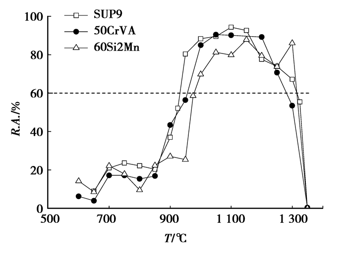 从断面收缩率数据可知,SUP9、50CrVA、60Si2Mn的良好塑性温度区间分别为931~1 314 ℃、957~1 280 ℃、981~1 315 ℃,在上述区域,3个钢种的R.A.值均在60%以上,具有良好的热塑性,其原因是发生了动态再结晶。动态再结晶是指金属在热变形过程中发生的再结晶现象。再结晶新晶粒形成的过程中,晶界在高温高应变下获得足够的驱动力而发生迁移,如果此时晶界迁移的速度超过了晶界滑移的速度,就可以将原来铸态晶界上的裂纹包含进去,使铸态晶界上的裂纹源减少,同时也阻止了裂纹源沿原铸态晶界的扩展,因此塑性提高。而高温有利于晶界的迁移,因此,该温度区间内表现为塑性良好的穿晶断裂。另外,从成分上来看,3个钢种中Mn含量均在0.7%以上,锰硫比较高,这对提高钢的塑性有利。