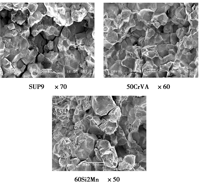 2) 得出了SUP9、50CrVA、60Si2Mn 3个钢种的第Ⅰ脆性区(Tm~1 315 ℃,Tm~1 281 ℃,Tm~1 316 ℃)和第Ⅲ脆性区(600~930 ℃,600~956 ℃,600~980 ℃)。第Ⅰ脆性区的断裂机理是:P、S、O等有害元素在枝晶间富集,形成液膜,使晶界间的结合强度降低。第Ⅲ脆性区的断裂机理是奥氏体晶界析出铁素体,以及AlN等物质在晶界析出。