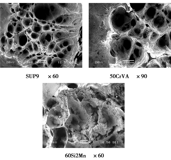 3个钢种试样在1 000 ℃的断口形貌如图 7所示,试样中断口表面有许多深浅不同的凹坑存在,且凹坑周围均发生较大的塑性变形。表明试样在变形时,晶粒内部形成孔洞,当继续变形时,孔洞长大并连接形成颈缩,直至断裂,此时断裂方式为穿晶塑性断裂。SUP9、50CrVA、60Si2Mn 3个钢种断面收缩率均在60%以上,相应数值分别为88.3%、84.9%、69.8%。
