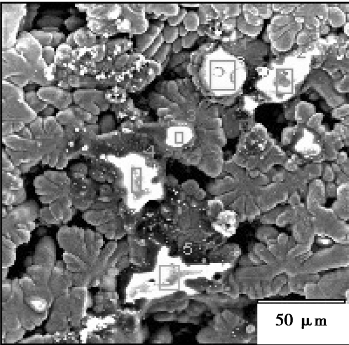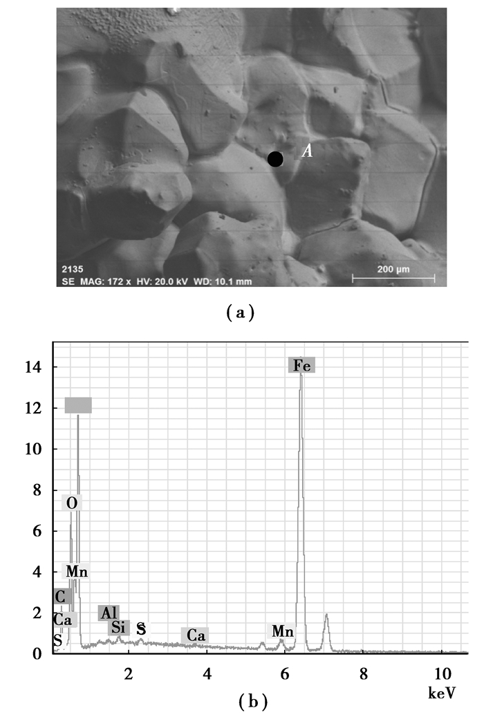 由表 3可知,图 8中试样断口处5个检测点的夹杂物主要成分均为SiO2和MnO,以及少量含Ca夹杂,其余夹杂物分别为含有少量Al、Ti、Cr的氧化物。从截面夹杂物的尺寸来看,第2、4、5号夹杂物尺寸约为50 μm,1号夹杂物尺寸约为30 μm,3号夹杂物最小,约为10 μm。夹杂物的存在,能够作为应力集中源,在晶界间形成微孔,进而相互连接形成裂纹。该试样断裂时,测得其断面收缩率仅为0.4%,抗拉强度为17.68 N/mm2,而该温度下正常断裂的试样断面收缩率为87.8%,抗拉强度为22.03 N/mm2。由此可见,该试样断口处夹杂物的存在是导致其塑性、抗拉强度降低的主要因素。