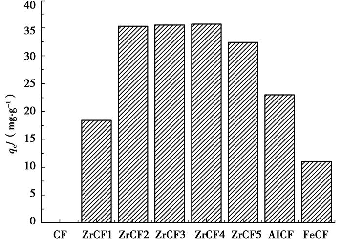 2 结果与讨论 2.1 吸附剂的制备对除氟的影响 2.1.1 几种MICF吸附剂的除氟性能比较在氟离子初始质量浓度38 mg/L,自然pH,吸附剂用量0.1 g,吸附24 h,303 K的条件下,胶原纤维(CF),ZrCF(负载量分别为0.05、0.1、0.15、0.20 mol的吸附材料ZrCF1,ZrCF2,ZrCF3,ZrCF4)氧化锆(ZrCF5),AlCF,FeCF的除氟效果见图 1。结果表明胶原纤维负载锆(ZrCF)的除氟效果最好,其平衡吸附量远远高于载体胶原纤维(CF),氧化锆(ZrCF5),胶原纤维负载铝(AlCF)和胶原纤维负载铁(FeCF)。随着材料中Zr(Ⅳ)含量的增加,ZrCF除氟能力也逐渐增强。但当Zr(Ⅳ)的负载量大于0.1 mol后,材料对氟的吸附量增加不明显。用等离子体发射光谱(ICP PerKinElmer OPTIMA2100DV)分析制备反应溶液中Zr(Ⅳ)的残余量,发现负载量为0.20 mol的制备液中Zr(Ⅳ)的含量较高,即0.2 mol Zr4+中有很多未被负载,说明胶原纤维对Zr(Ⅳ)的负载能力已达到饱和。因此后续实验中确定Zr(Ⅳ)的负载量为0.1 mol。因此,后续的实验中选定负载量为0.1 mol ZrCF为主要的研究对象。