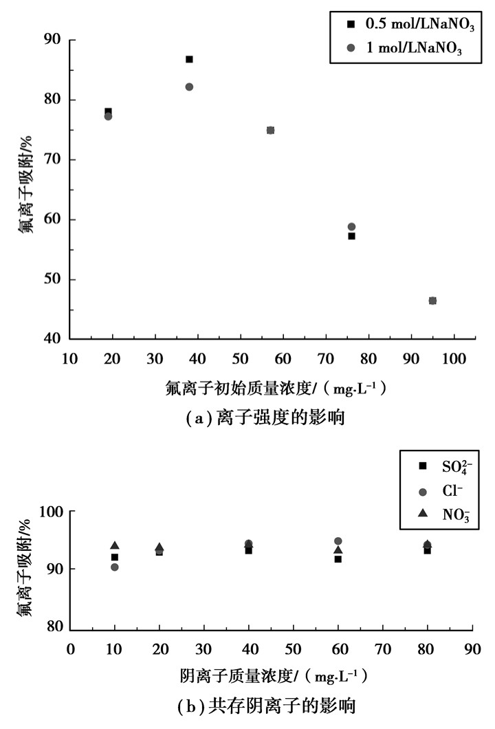 1.3.2 离子强度和共存无机阴离子对吸附的影响方法与1.3.1相同,考察离子强度影响时,氟离子的初始质量浓度分别为19、38、57、76、95 mg/L;溶液的离子强度用NaNO3调节(NaNO3的浓度分别为0.5、1 mol/L);考察共存无机阴离子的影响时,氟离子的初始质量浓度为19 mg/L,共存无机阴离子Cl-、NO3-、SO42-(所加盐分别为NaCl、NaNO3、Na2SO4)的质量浓度分别为10、20、40、60、80 mg/L。