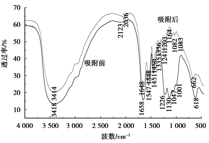 金属水合氧化物无机吸附材料的表面金属配位羟基对阴离子的吸附机制起着重要作用,其吸附机理可以通过IR光谱中的表面振动结构得到比较合理的阐述[20]。吸附氟离子前后ZrCF的IR光谱图如图 6所示。材料中羧基上的羟基表现为3 330~3 600 cm-1的OH的伸缩振动;由于参于了与金属离子的配位[21]使COO的伸缩频率由1 658 cm-1(CF中COO-的伸缩谱带)位移至1 648 cm-1。1 547、1 451、1 335 cm-1是反映氨基酸类物质于1 700~1 250 cm-1有精细结构的大范围吸收的特征谱带[22];金属表面羟基通常出现在1 200 cm-1以下,在1 600 cm-1没有弯曲振动模式,这是金属表面羟基与H—OH的不同之处。图中吸附前的IR光谱表明材料在1 130 cm-1处出现了M—OH的伸缩振动模式强峰[23]。