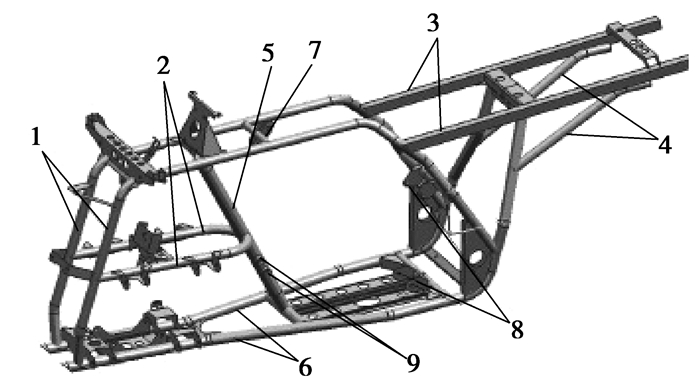 图 1 全地形车车架三维模型 1.车架左右上管;2.左右联接管;3.方管组合;4.左右后支承管;5.前撑管;6.车架左右下管;7.发动机前上支承;8.发动机后支承;9.发动机衬管 |