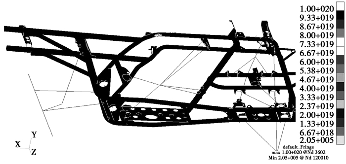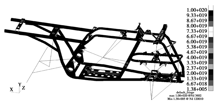 利用optistruct求解器对全地形车车架进行自由状态下的模态分析,设定频率范围为0~200 Hz,提取前6阶的自由模态值。