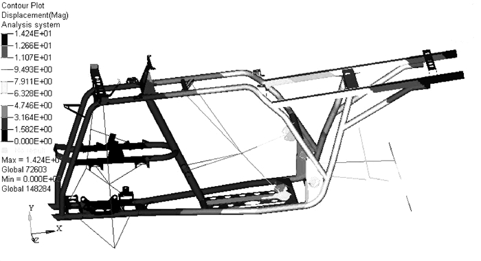 分析该全地形车车架发现,车架主要是由各种截面的薄壁管焊接而成,其厚度与长度和截面尺寸相比很小,因此采用shell63单元能够很好地表达其结构特性[9-10]。采用HyperMesh对车架进行有限元网格划分,划分过程中忽略焊点对结构刚度的影响,直接采用壳单元连接[11]。最终建立的有限元模型如图 2所示。