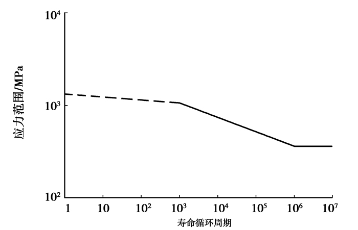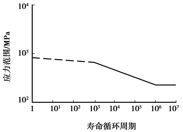 3 全地形车车架疲劳寿命分析对车架进行疲劳寿命分析必需具备三大条件,即结构的几何特征、材料的疲劳属性及载荷时间历程。前面分析得到的有限元模型及应力结果即是结构的几何特征。根据车架的材料10和Q345,取可靠度为99%的疲劳寿命曲线,在MSC.fatigue中得到材料S-N曲线[15]如图 5、图 6所示;本文研究的对象属于高周疲劳,其总体应力水平不高,应变相对较小,适合选用名义应力法来计算疲劳寿命。车架系统中的载荷是外部集中载荷,以时间历程的形式来定义,故采用图 7所示的载荷时间曲线。
