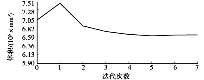 4.3 轻量化结果根据前面确定的车架优化的设计变量、目标函数和约束条件后,提交给Optistruct求解器分析,经过7步迭代后得到车架尺寸优化的结果如表 5所示,优化过程中目标函数的变化曲线图如图 9所示。最终减重了6.606 3 kg,优化后车架总体质量减轻了25.9%。