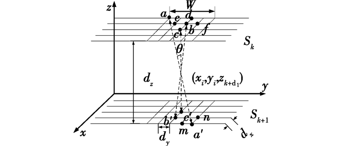 | $ \begin{array}{l} \;\;\;{\theta _{{\rm{m, n, }}k}}{\rm{ = }}\\ ar\cos \left( {\frac{{\left| {v({x_{\rm{m}}}, {y_{\rm{n}}}, {z_k})-v(x{'_{\rm{m}}}, y{'_{\rm{n}}}, {z_{k + 1}})} \right|}}{{{d_{\rm{z}}}{D_{{\rm{m, n}}, k}}}}} \right)。\end{array} $ | (4) |