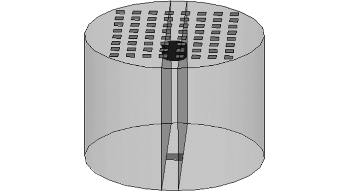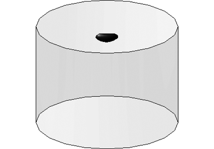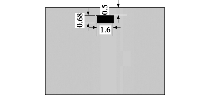 2 插值结果及算法验证 2.1 插值结果实验开发环境为Visual C++6.0,实验模型是浸泡在圆柱体水槽中电导率为2.1 S/m的圆柱体异物,如图 2所示,圆柱形水槽的上表面是电极阵列,底部是背电极。图 3是圆柱体异物在圆柱形水槽中的位置和尺寸,圆柱体上表面距水槽上表面0.5 mm,圆柱体异物的半径为0.8 mm,高度为0.68 mm。沿圆柱体直径方向在每排电极阵列正下方获得8片切片,由一步牛顿法重构得到二维图像。插值后共有15片切片数据,即每相邻两层之间插值出一层新图像。