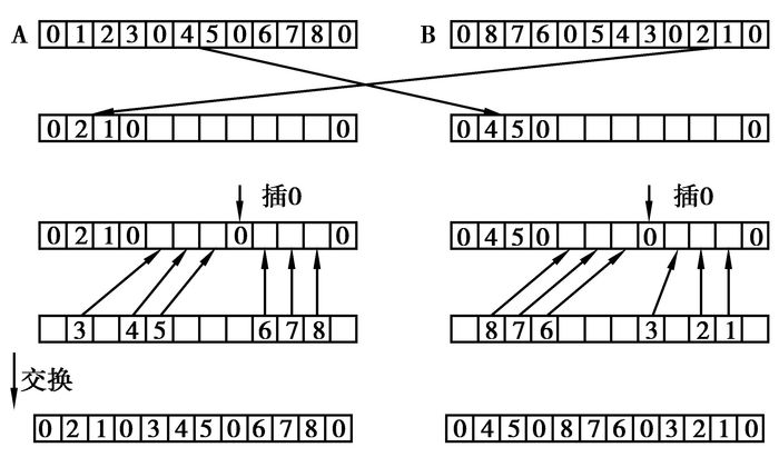 5) 最大保留交叉算子:根据车辆调度问题染色体编码组间无序组内有序的特点,设计交叉算子选择交叉点时,选择在0的位置,当交叉点不是0时,选择最近的0位置作为交叉点。具体操作如图 1所示。