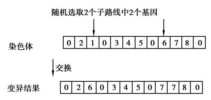 6) 变异算子:随机选择2个非0编码,交换其位置,产生新染色体,具体如图 2所示。