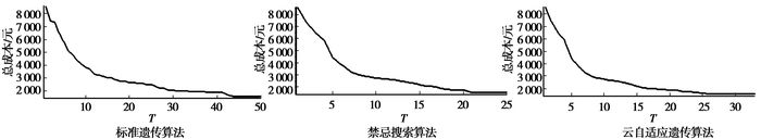3.2 算法对比分析为了检验云遗传算法的求解性能,在此,分别采用标准遗传算法[21]、禁忌搜索算法[21]和云自适应遗传算法对上算例进行实验,收敛状况如图 3所示。