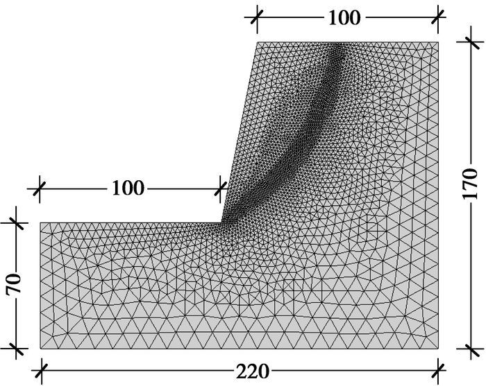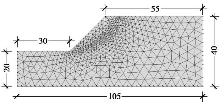 2 算例 2.1 一般边坡模型算例边坡模型如图 3所示。边坡坡度为45°,高20 m。土体材料为服从Mohr-Coulomb屈服准则与非关联流动法则(膨胀角ψ=0)的理想弹塑性材料,土的容重γ=20 kN/m3,粘聚力c=42 kPa,内摩擦角φ=17°,弹性模量E=100 MPa,泊松比υ=0.3。