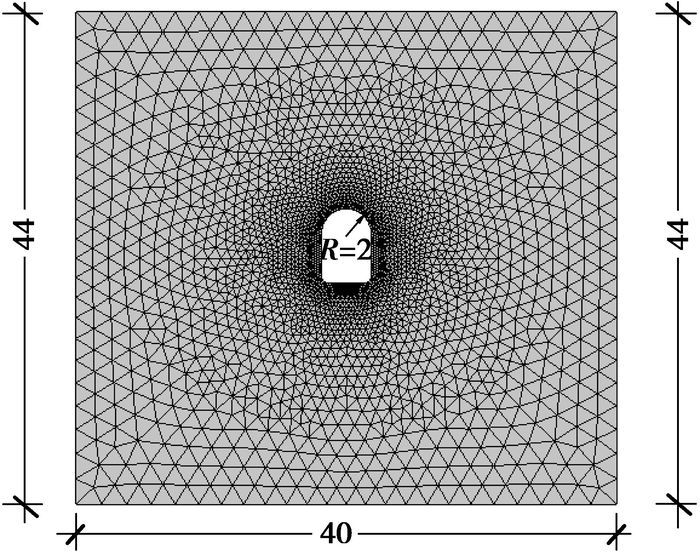 2.3 隧道模型隧道模型如图 8所示,隧道埋深16 m,洞高6 m。围岩为服从Mohr-Coulomb屈服准则与非关联流动法则(膨胀角ψ=0)的理想弹塑性材料,围岩的重度γ=20 kN/m3,粘聚力c=120 kPa,内摩擦角φ=23°,弹性模量E=1.5 GPa,泊松比υ=0.42,该隧道为一未支护的裸洞。为了避免局部应力集中造成计算不收敛,影响计算结果,在建模时,将拱墙与底板相交处的尖角采用圆弧过度。