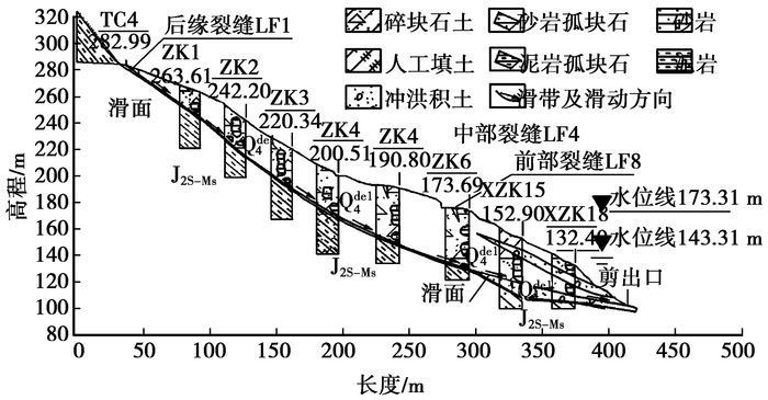 1 滑坡概况 1.1 滑坡地质条件及形态特征凉水井滑坡位于云阳故陵镇的长江右岸斜坡地带,滑坡平面形态呈“U”形,为圈椅状地形,南高北低,后部和前部地形较陡,中部地形较缓,自然坡度20°~35°。滑坡前缘高程约100 m,后缘高程约319.5 m,纵向长约434 m,横向宽约358 m,面积约11.82×104 m2,总体积约407.79×104 m3。滑体为滑坡堆积(Q4del),物质组成在竖向上变化较大,上部为含角砾粉质粘土、碎块石土,下部为砂岩、泥岩块石及未完全解体的巨块石。滑床为侏罗系中统沙溪庙组(J2s)泥岩和砂岩互层,岩层产状为340°∠45°~51°。滑面后部较陡,从中部到前部逐渐变缓,整体略向左倾,为推移式滑坡,滑带为含角砾粉质粘土,厚3~5 cm,含水量高,滑动方向与现坡向基本一致。典型地质剖面见图 1。