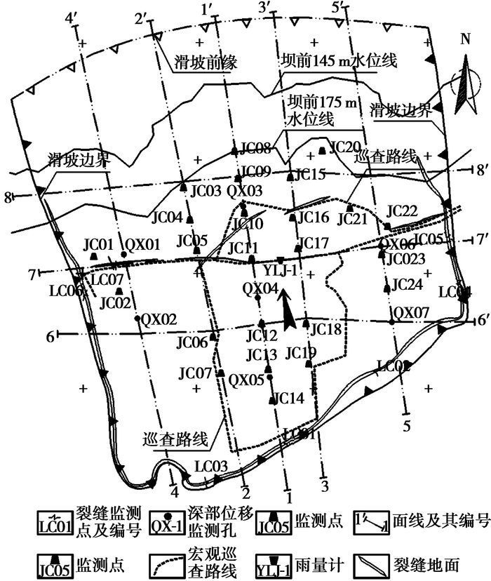 本滑坡主要采用远程自动化实时监测,内容包括:地表位移监测、地裂缝监测、深部位移监测和雨量监测,监测方案见图 2。各监测项目每4 h观测1次,汛期或变形加速期每2 h观测1次,变形强烈时1次/ h,紧急情况连续监测。