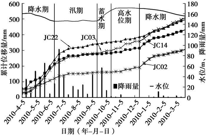 图 3和表 1表明,该滑坡各部位在各阶段变形趋势基本一致,整体变形缓慢,全年位移量平均为400.73 mm,最大为509.90 mm(JC03)。2010年4月5日至6月10日三峡库水位下降且降雨量较大,各监测点累积位移曲线斜率均较大,主要受库水位下降和降雨影响,各区域变形速度关系为右侧>后缘>中前部>左侧;2010年6月11日至9月15日,库水位在145~146 m之间波动,变形主要受降雨影响,平均速率较小,大小关系为右侧>后缘>前缘>左侧;2010年9月15日至10月23日蓄水至170 m左右,主要受库水位影响,平均速率进一步减小,其大小关系为前缘>右侧>后缘>左侧;2010年10月24日到12月17日库水位在170~171.3 m波动,滑坡各部位变形规律与蓄水期一致,变形主要受库水位控制;2010年12月18日至2011年3月25日库水位下降,滑坡整体变形加剧,各区域变形速度关系为前缘>后缘>右侧>左侧。整体表明,2010年4月~6月由于库水位下降较快且有降雨作用滑坡变形最强烈,2010年12月~2013年3月库水位降落较慢变形强度次之,然后为汛期,再其次为高水位期,蓄水期变形最慢。降雨对滑坡后缘及右侧变形影响较大,库水位变化对滑坡前缘和后缘变化较大。