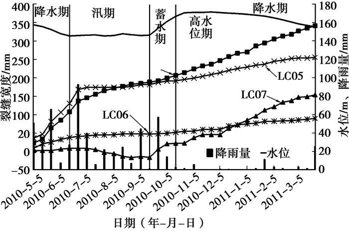 滑坡左前部的LC07为在汛期受后侧滑体挤压裂缝宽度有减小的现象,与该区地表隆起变形相符,在库水位作用强烈时演变为张拉裂缝,且受库水位影响,变形较强烈。