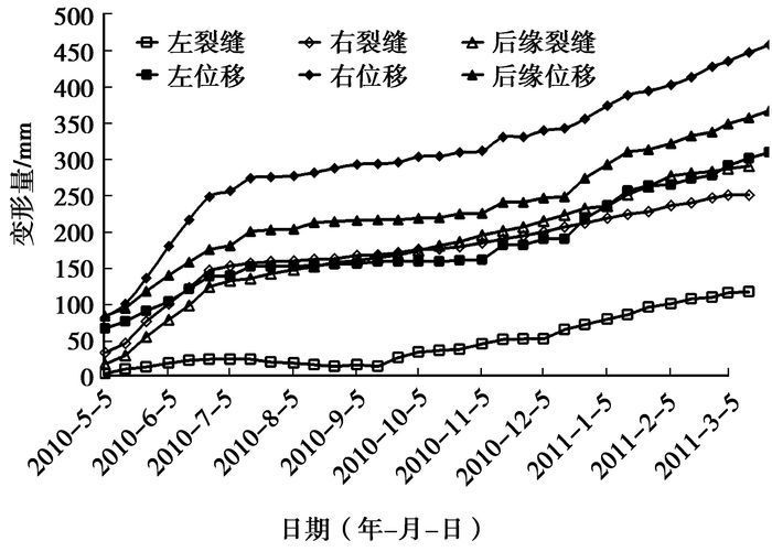 4) 根据当前库水位调节模式,2010年4月~6月由于库水位下降较快且有降雨作用滑坡整体变形最强烈,2010年12月~2011年3月库水位降落较慢变形强度次之,然后为汛期,再其次为高水位期,蓄水期变形最慢。