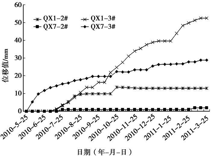 图 6 QX1和QX7深部位移曲线图 QX1-1#和QX7-1#位移曲线与时间轴重合 |