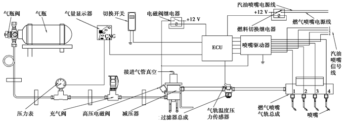 系统的工作原理为:高压管路将CNG气瓶和减压器电磁阀相连,约20 MPa的高压气体经过减压器后减压变为高于进气歧管压力200~230 kPa的低压燃气;低压燃气经过气体滤清器后进入气轨,并被分配到燃气喷嘴;ECU根据发动机的负荷、转速、气轨压力和温度等参数计算在进气歧管处所需喷入的燃气量[6]。