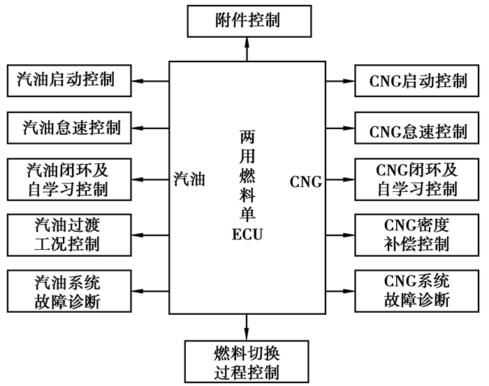 2 系统控制策略在汽油发动机电控管理系统中,ECU软件一般包括启动控制,闭环自学习控制策略、过度工况控制以及怠速控制策略等[5]。笔者所设计的两用燃料发动机单ECU控制系统不仅包括了这些控制策略[7],同时针对CNG燃料理化特性采取了特有的控制策略,以提高排放水平,减少动力损失,实现车辆平稳运转。图 2是两用燃料单ECU软件功能控制示意图。