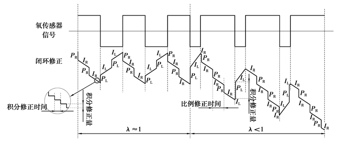 闭环控制过程如图 3所示,在λ < 1时,氧传感器信号输出高电压,指示混合气为浓,ECU接收到此信号后,首先使燃料喷射量闭环修正骤降一个PR值(即混合气浓时的比例控制),然后以速率IR(即混合气稀时的比例控制)逐渐降低,直到λ>1,即指示混合气为稀。在ECU接收到氧传感器信号为稀的信号后,又会使修正先跃升一个PL值,然后以速率IL逐渐上升,增加燃料喷射量,直到λ < 1;如此反复,实现空燃比的精确控制。